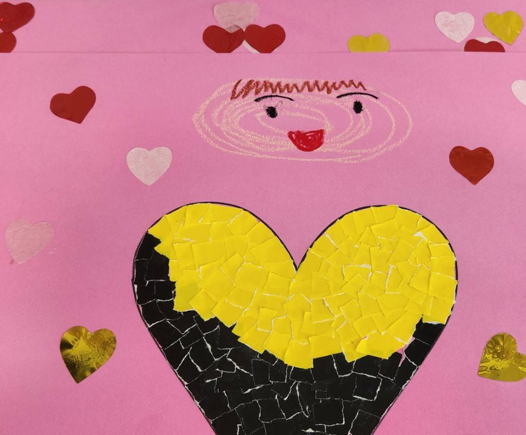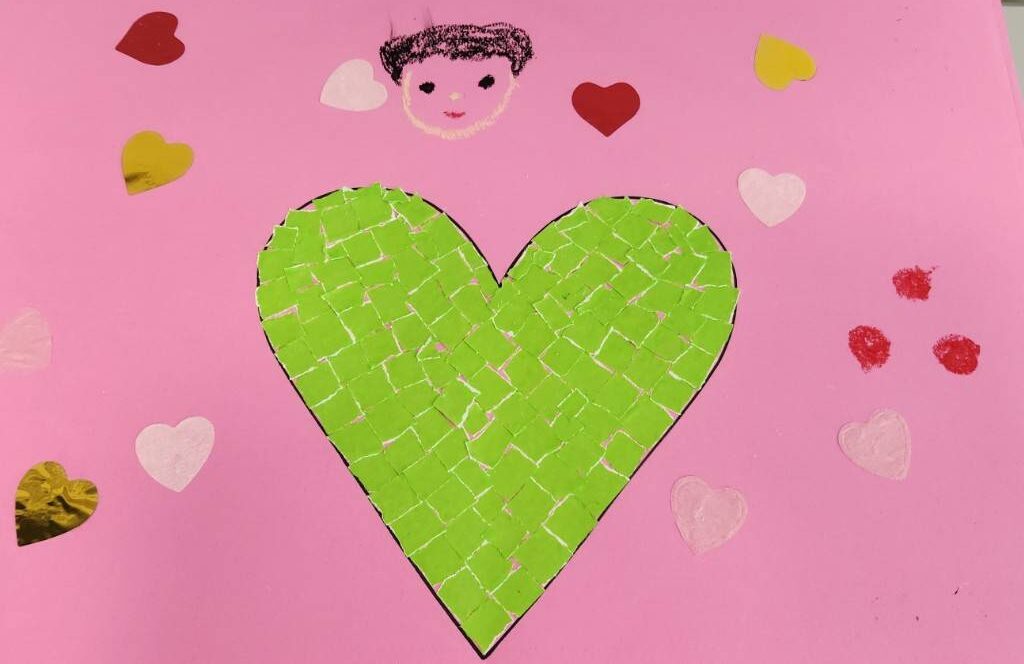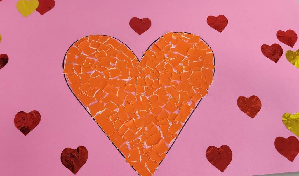 まずは、ピンクの色画用紙に描かれた大きなハートの下絵に、ちぎり絵を貼っていく作業です